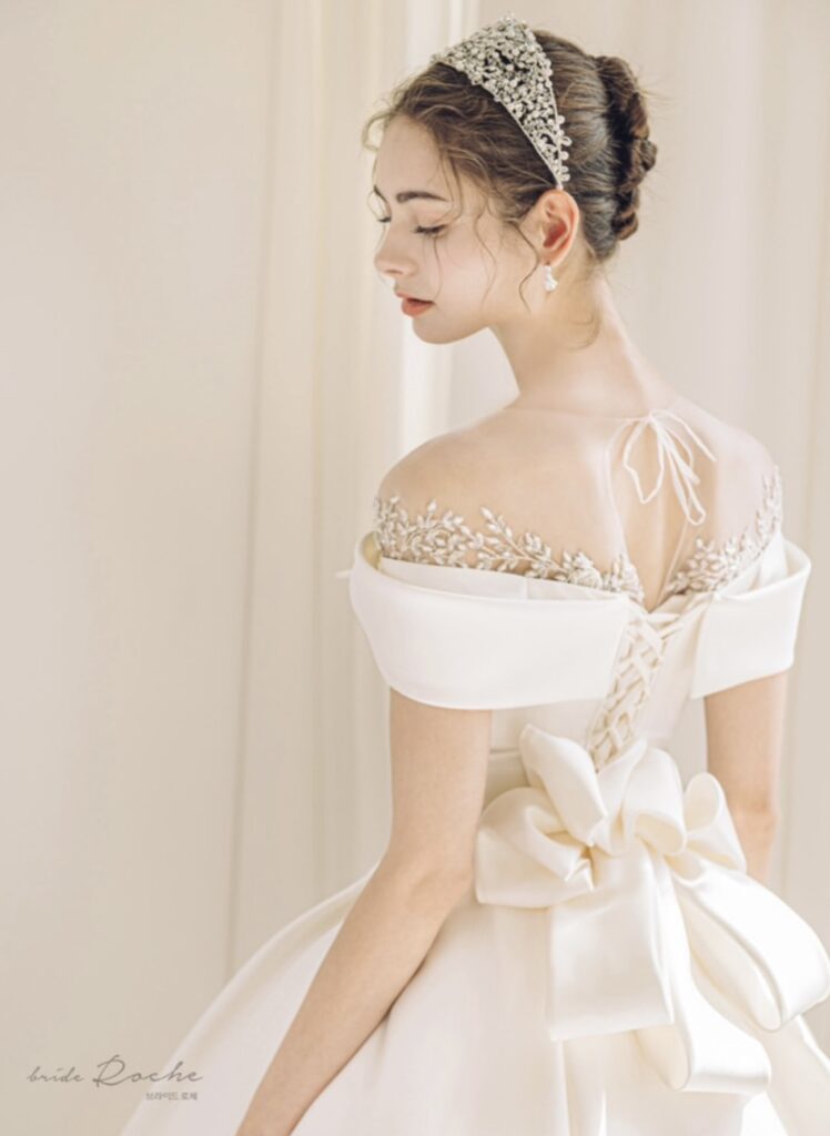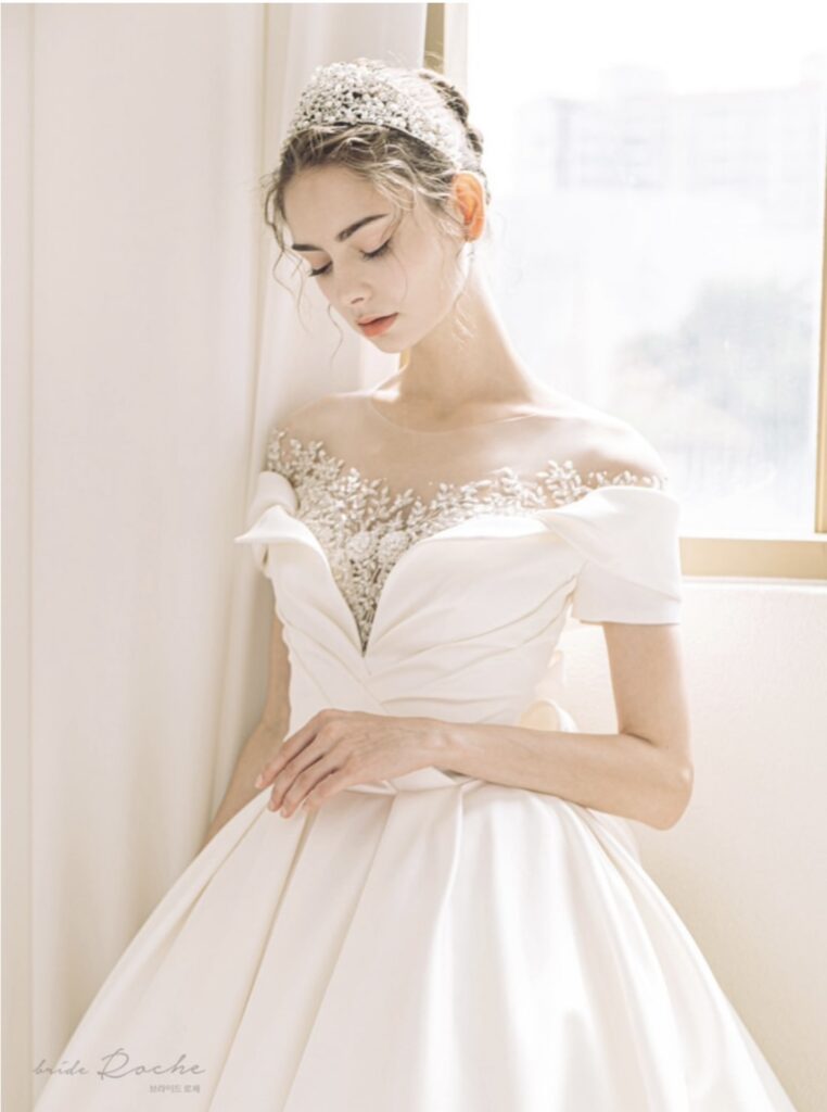 重厚感のあるサテンを使用し正統派でありながら、胸元のシースルー感とビジューが個性を放つウェディング
