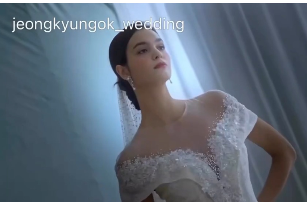 シンプルなマーメイドラインでありながら、ふんだんに使用されたグリッターが存在感を出してくれる1着