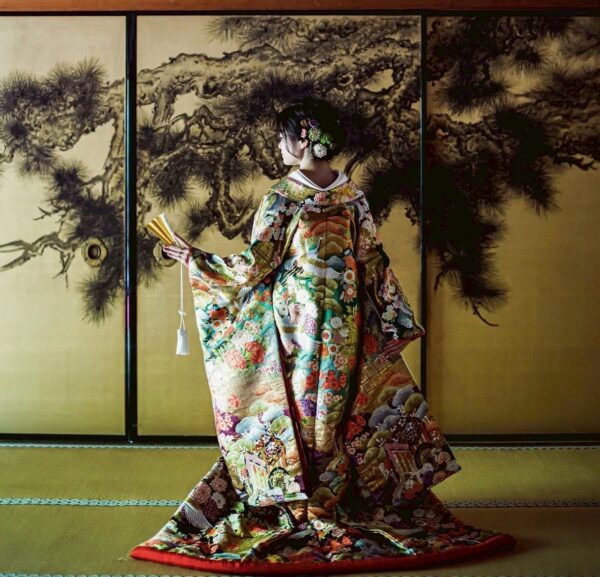 京都の熟練の職人が織機械の使用可能な色数を最大限に折り込み、おめでたい舞鶴や四季折々の花はもちろん、金銀糸もふんだんに使用した絢爛豪華な色打掛です。